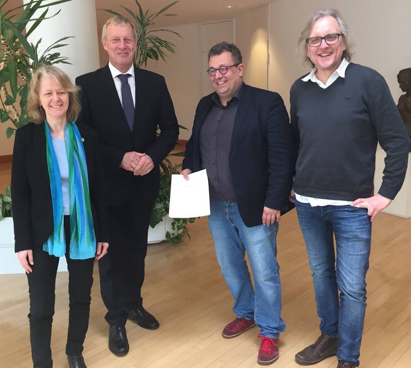 Auf dem Bild (von links): Ingrid Reuter, Fraktionssprecherin der GRÜNEN im Rat, Jörg Stüdemann, Kämmerer der Stadt Dortmund Mehrdad Mostofizadeh, kommunalpolitische Sprecher der GRÜNEN Landtagsfraktion, Ulrich Langhorst, Fraktionssprecher der GRÜNEN im Rat.