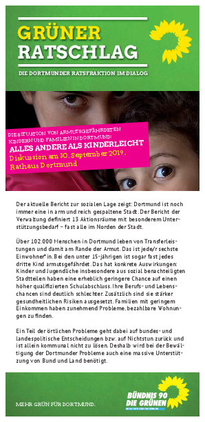 Unter dem Titel „Alles andere als kinderleicht“ will die Ratsfraktion am Montag, den 30. September, 19.00 Uhr, im Rathaus Dortmund mit Expert*innen die Situation von armutsgefährdeten Kindern und ihren Familien analysieren und nach konkreten Handlungsmöglichkeiten suchen. Unter der Moderation von Fraktionssprecher Ulrich Langhorst werden